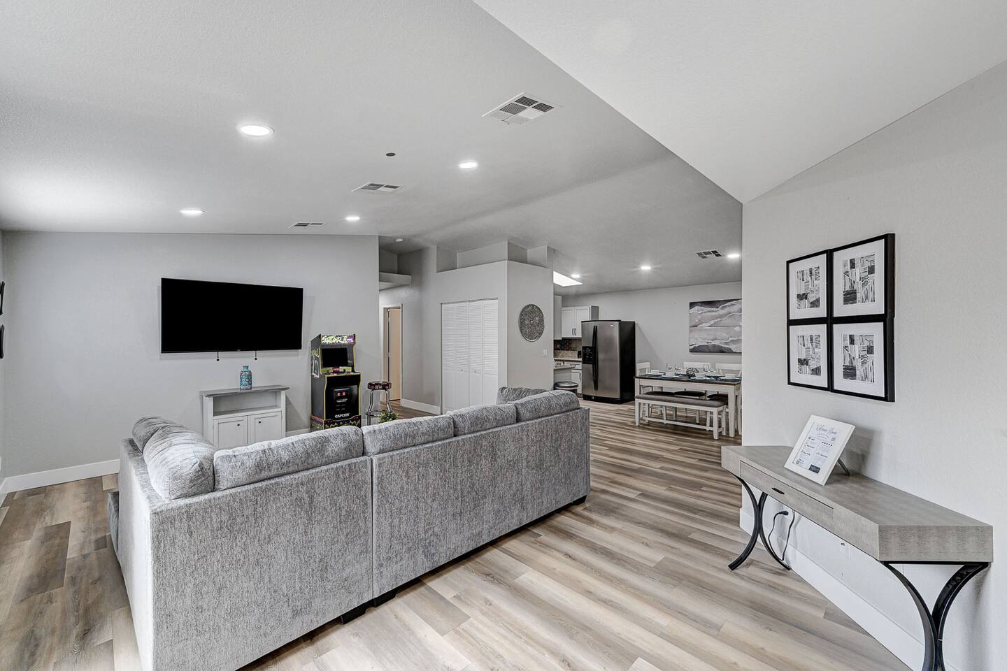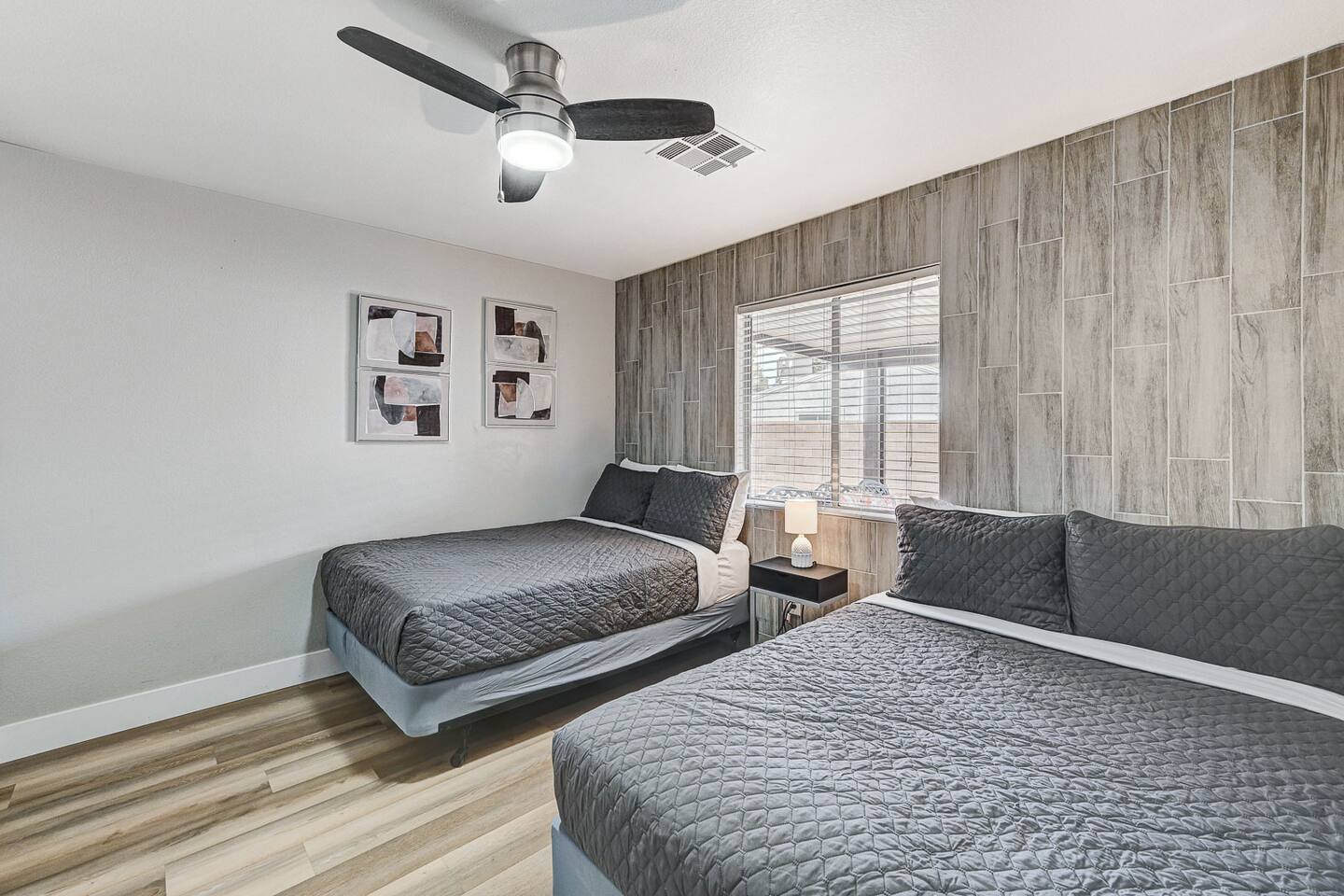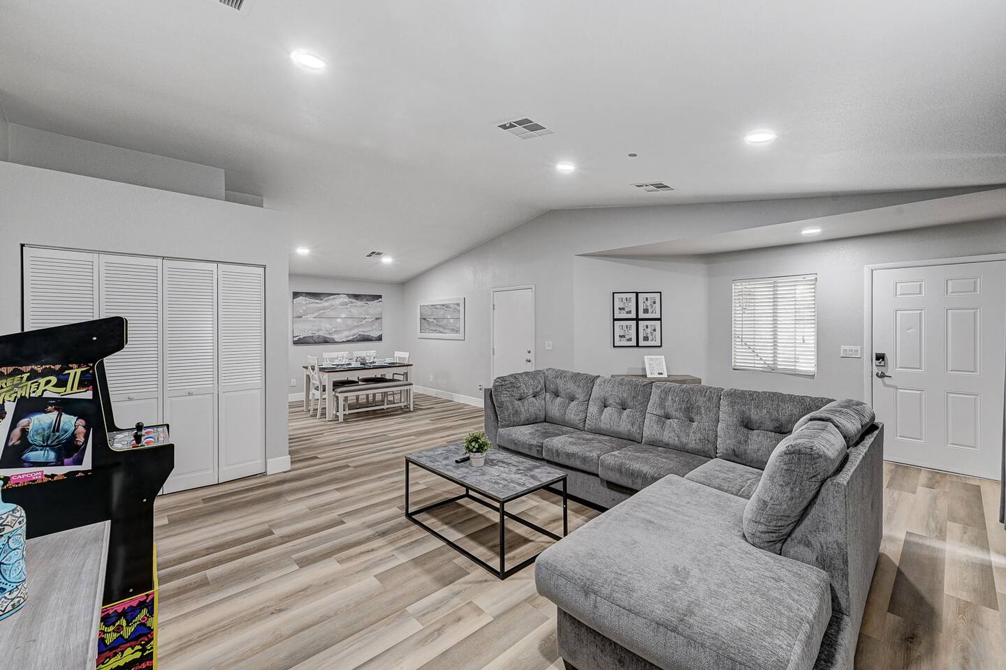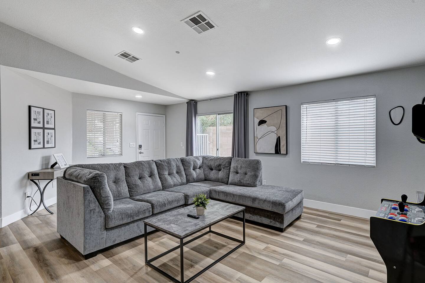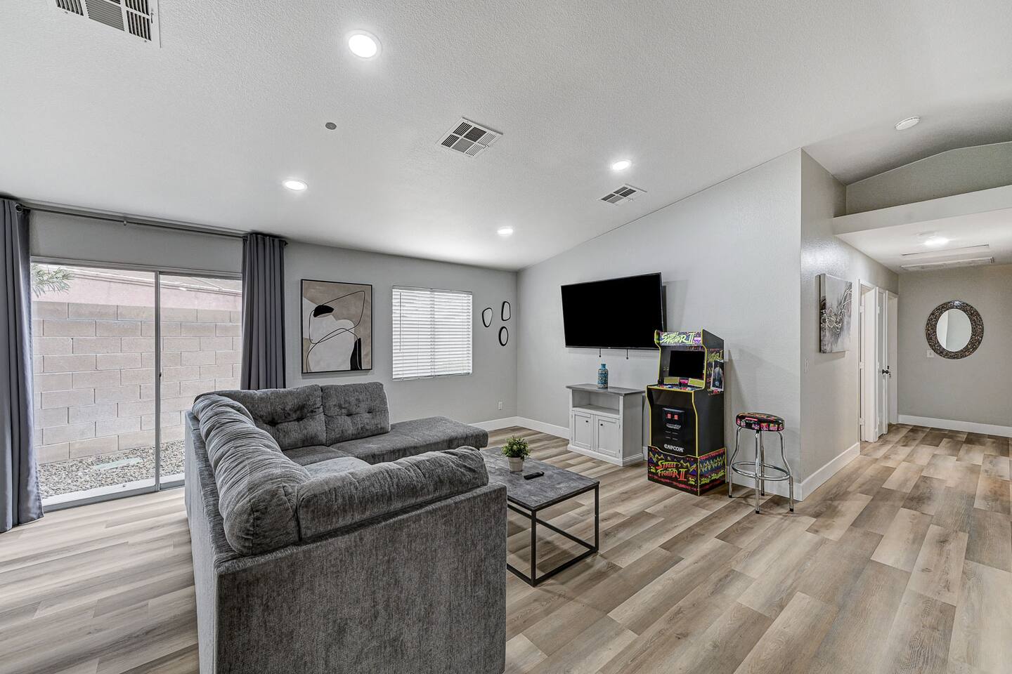 Welcome to Your Modern Las Vegas Retreat 🌟 Stylish, spacious, and perfectly located near The Strip and Downtown, this beautifully furnished North Las Vegas vacation rental is ideal for families, groups, and business travelers. Just minutes from major highways, this home offers modern comforts and a private backyard oasis — your perfect base for exploring all that Las Vegas has to offer. 🚗 Conveniently Located Near: -Major Highways: 215 & 95 -15 minutes to the Las Vegas Strip -20 minutes from Harry Reid International Airport (McCarran) Whether you're heading to a convention, a show, or a hike, everything is easily accessible from this central location. 🛏 Comfortably Sleeps Up to 10 Guests This spacious home is designed for rest and relaxation, with plenty of room for everyone: Master Suite: 2 Full-Size Beds Guestroom I: 2 Full-Size Beds Guestroom II: 1 Queen-Size Bed Perfect for families, group trips, and contractor stays in Las Vegas. ⭐️ Amenities That Make You Feel at Home • Wi-Fi: Free high-speed wireless internet throughout the home • Climate Control: Central air conditioning and heating for year-round comfort • Parking: Free parking for up to 3 cars in the driveway • Family-Friendly: Pack 'n play, high chair, and toys available • Workspace: Dedicated area with good lighting for remote work • Washer & Dryer: Includes detergent and fabric softener • Iron & Ironing Board: Available for your convenience • Extra Comfort: Additional blankets and pillows provided 🌴 Private Backyard with Outdoor Living Enjoy the Las Vegas sun in your beautifully landscaped backyard, featuring: • BBQ Grill • Outdoor Dining Area • Lounge Seating Perfect for relaxing evenings, morning coffee, or entertaining your group. 🎁 Additional Services • Special Packages: Celebrate birthdays, bachelor/bachelorette parties, and more — contact us to design your perfect VIP experience! • In-Home Spray Tans 👙: Book a convenient spray tan during your stay (advance scheduling required) • Babysitter Recommendations 🍼: We’ll connect you with trusted, local babysitters for peace of mind 🔑 Guest Access You’ll have full access to the entire home and all amenities. Check-in is easy and secure with our keyless entry system. Upon arrival, you’ll receive a welcome guide with everything you need to know about the house, nearby attractions, and local dining. 🏡 Neighborhood Overview Located in a quiet, gated community in North Las Vegas, this home is close to: - Local shopping and grocery stores - Dining and entertainment options - Hiking trails and scenic views - Public transportation and freeway access A safe, clean, and peaceful alternative to the busier tourist areas, with quick access to all the fun. 📜 Important Policies: ❌ No Unauthorized Pets – Please include any pets in your reservation to avoid additional fees ❌ No Parties or Events – To maintain peace and respect for our neighbors ✅ Quiet Hours – 10:00 PM to 7:00 AM 📸 Security Cameras – Installed on the perimeter of the home (including backyard and garage); no cameras inside 🛏 Perfect for: ✅ Families on vacation ✅ Group getaways ✅ Remote workers and digital nomads ✅ Business and contractor housing ✅ Extended stays in Las Vegas 📅 Book Your Las Vegas Vacation Rental Today! Whether you're here for a weekend getaway or an extended work trip, this modern, fully furnished home offers everything you need to enjoy Las Vegas in comfort and style. Don’t miss out – book your stay today! Things to Do: Outdoor Activities: Las Vegas Springs Preserve: Explore beautiful botanical gardens, hiking trails, and engaging museums focusing on the natural and cultural history of Las Vegas. Red Rock Canyon: If you're interested in outdoor activities, this natural area offers stunning scenery and hiking trails, though it's a bit of a drive from the Strip. Entertainment: -The Strip: Famous for its casinos, resorts, and entertainment options, the Las Vegas Strip is just a short drive away. Popular spots include the Bellagio, Caesars Palace, and the Venetian. Fremont Street Experience: Head downtown for the famous light and sound show, live music, street performers, and unique shops. Downtown Arts District: Explore local galleries, street art, and artisanal shops in this vibrant cultural area. Shows and Performances: Check out what’s playing during your stay, including Cirque du Soleil shows and various live performances. -Mandalay Bay: Located on the southern end of the Strip, Mandalay Bay features an expansive casino, a variety of restaurants, and an impressive pool area with a wave pool and lazy river. -Shark Reef Aquarium: Located within Mandalay Bay, this aquarium is home to a variety of marine life, including sharks, rays, and other exotic species. -T-Mobile Arena: If you’re into sports or concerts, T-Mobile Arena is a major venue for hockey games, concerts, and other events. Allegiant Stadium: Catch a football game or event at this state-of-the-art stadium, home to the Las Vegas Raiders and various concerts and events throughout the year. Shopping: The District at Green Valley Ranch: A nearby shopping center with a mix of shops, restaurants, and entertainment options. Fashion Show Mall: A bit further away on the Strip, this mall features a wide range of retailers and dining options. Las Vegas South Premium Outlets: For shopping enthusiasts, this outlet mall offers a wide range of designer and brand-name stores at discounted prices. Town Square: A great outdoor shopping center with a variety of shops, restaurants, and a movie theater. Family-Friendly Activities: Shark Reef Aquarium: Located at Mandalay Bay, it’s a fantastic spot for families to see diverse marine life. Las Vegas Natural History Museum: Great for all ages, with engaging exhibits on dinosaurs, ancient Egypt, and more. Unique Experiences: High Roller Observation Wheel: Ride the tallest observation wheel for stunning views of 